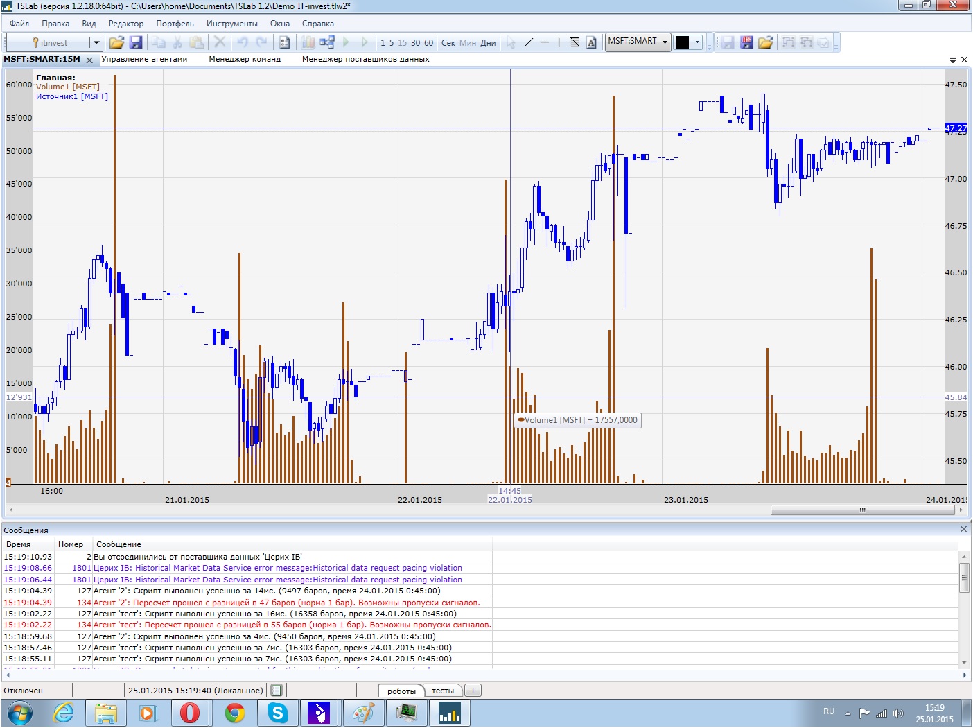 0 перед началом торговли обязательно надо проверить свой статус в настройках вебкабинета IB и поставить непрофессионал... иначе будут проблемы с подключением исторических данных... я попытался подключаться как профи, надеясь что мне за большую цену предложат больший сервис... однако обламался - не подключили совсем, только сделав непрофессионала в настройках я получил доступ к графикам... 1 Крайне медленно качает данные... 2 закачка исторических данных происходит так... загружает за 2 мин 500-2000 свечей, потом виснет на 10 мин... затем опять подгружает свечи... затем опять виснет...сейчас например (воскресенье) 4000 баров выкачивал в 4ре подхода за пол часа... выкачиваю при помощи бота... т.е запускаю бота в нужной бумаге... если качать через график или тестирование бота то очень часто тслаб виснет намертво - требуется перезагрузка тслаба через диспетчер задач... 3 при вводе тикеров требует сохранение через выход из программы, если программа подвисла то все введеные тикеры теряются