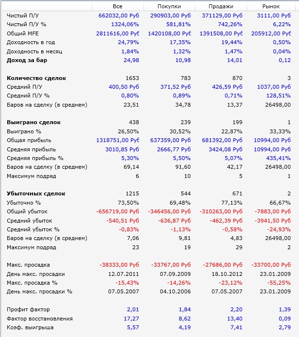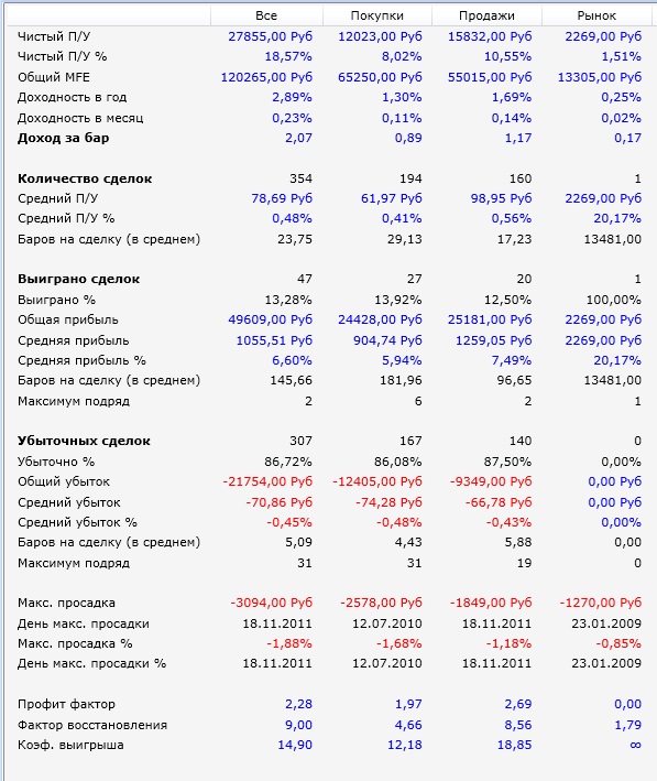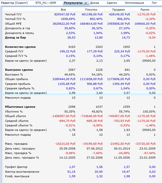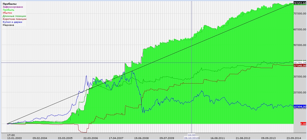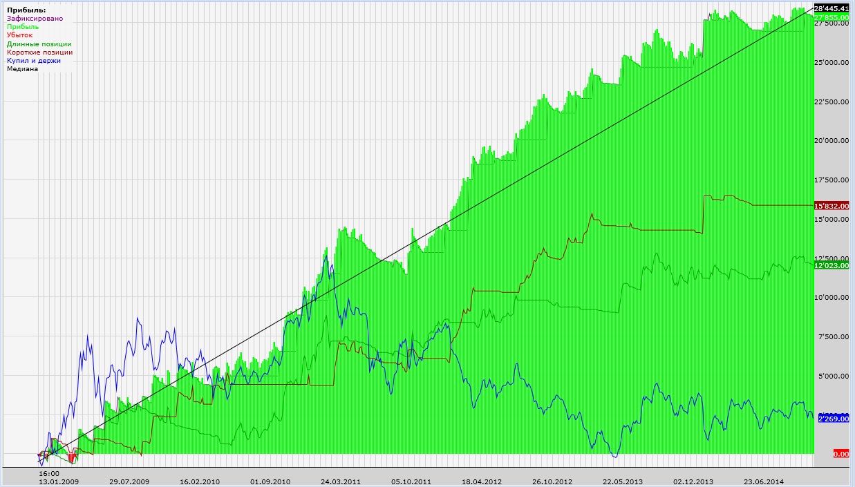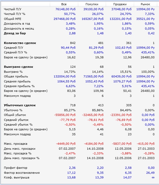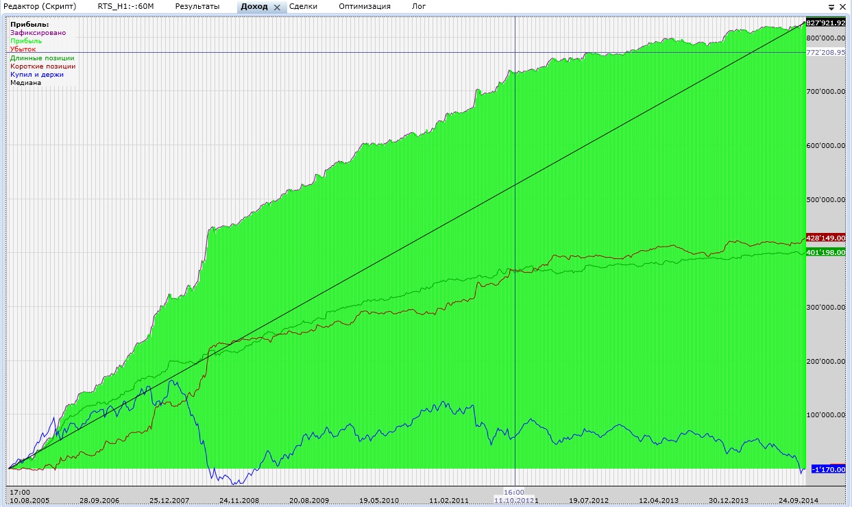 Покрутил. На Сбере с 2008 по 2014 доходность зашкаливает. На РТС доходность получилась немного меньше, но там прибыльных сделок почти 50% добился. А теперь скрестил их все в одну стратегию - получилось интересно.