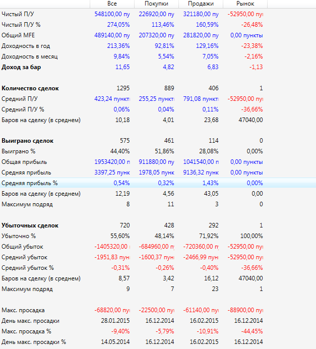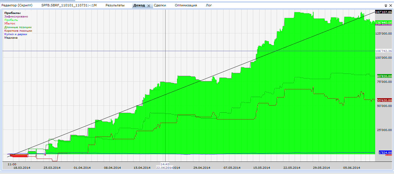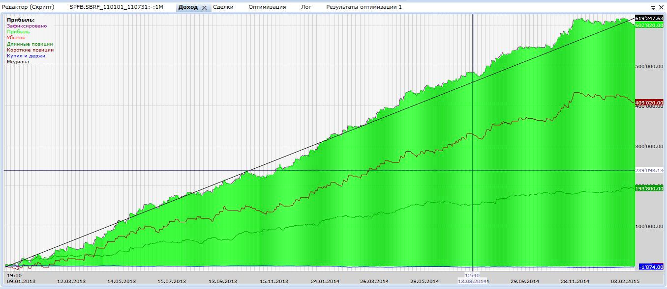 Вот еще пример торговой системы без индикаторов по сбербанку Скинь не завесь год, а по скрину за каждый контракт отдельно, то есть Sbrf-3.15, sbrf 6.15, sbrf-12.14, sbrf-9.14, sbrf-6.14!! И хотя бы пару слов о нем, параметры много ли их, какие! Можно в личку! Касаемо параметров. их всего два. тейк и стоп лосс. система написана через лог формулы