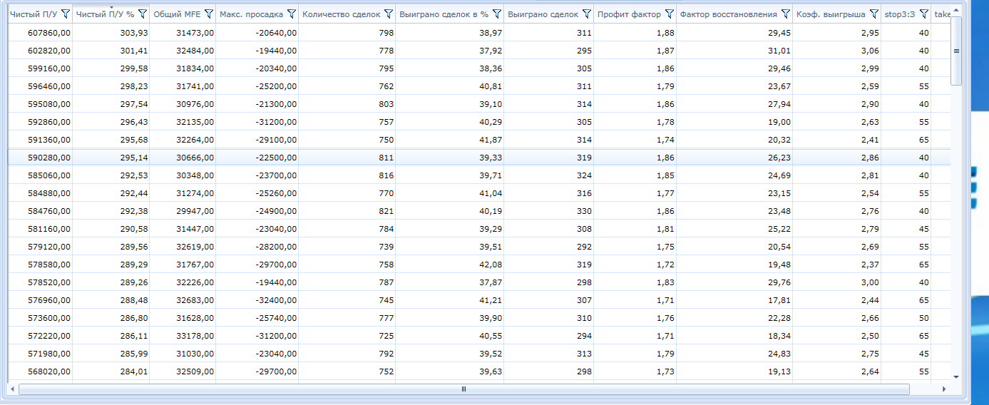 Таблицу результатов из лаборатории. Одним контрактом не покажете? В реальных торгах я не торгую 1 контрактом. Вам скрин сделать, где 1 контракт торгуется? Вот результаты. параметры оптимизации скидывал в начале топика.