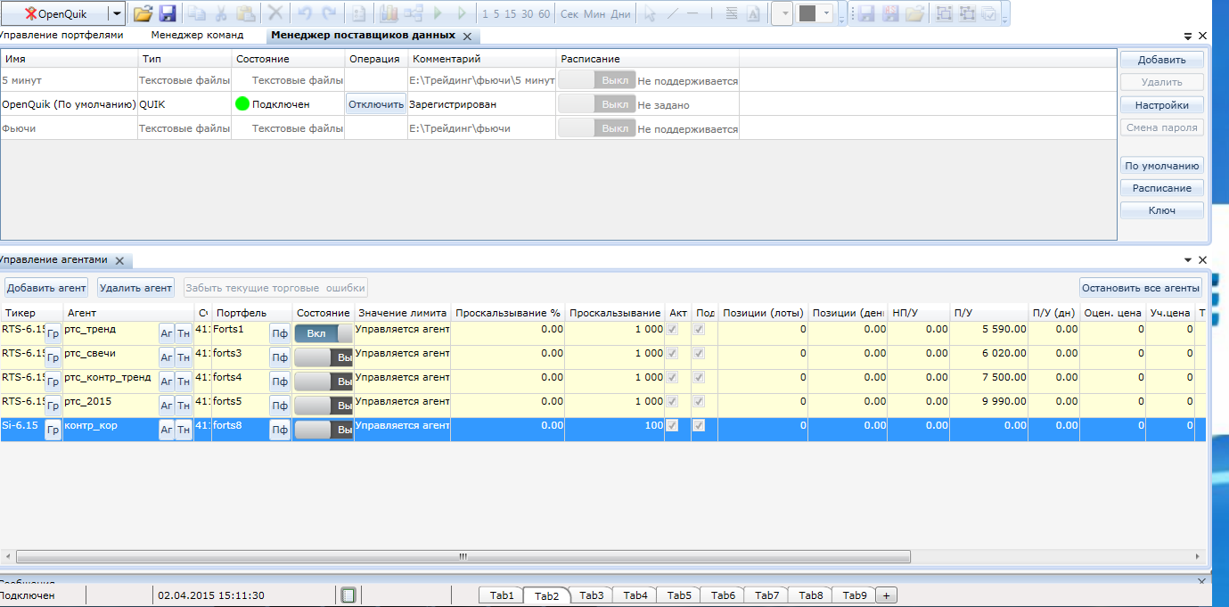 Около 5-ти торговых систем сейчас в работе. Хоть пару агентов по текущему контракту выложи, пожалуйста! Вот 5 ботов стоят с начала февраля. последнему пришлось поменять имя, стата обновилась. баланс 200 000р. то есть это примерно по 7.5% за месяц, если без учета последнего бота.