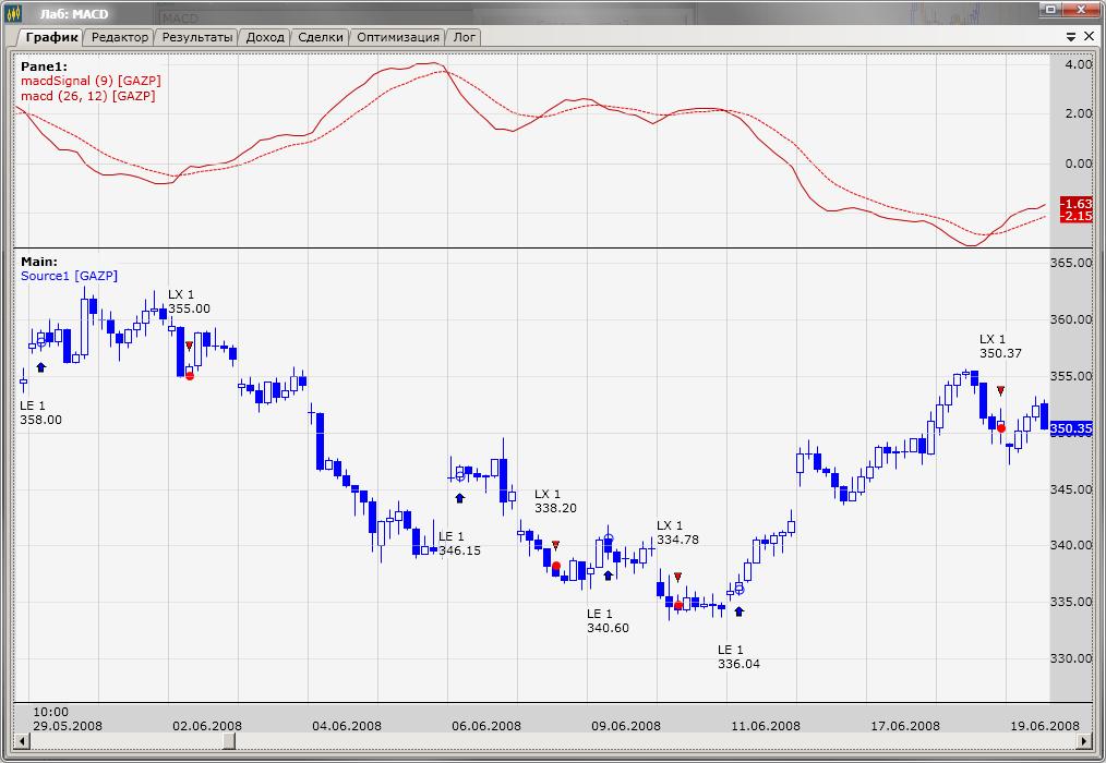 Кроме того, в нашем тестовом скрипте нужно поменять местами сигналы входы и выхода. Т.е. "Пересечение сверху" заменить "Пересечение снизу" и наоборот.