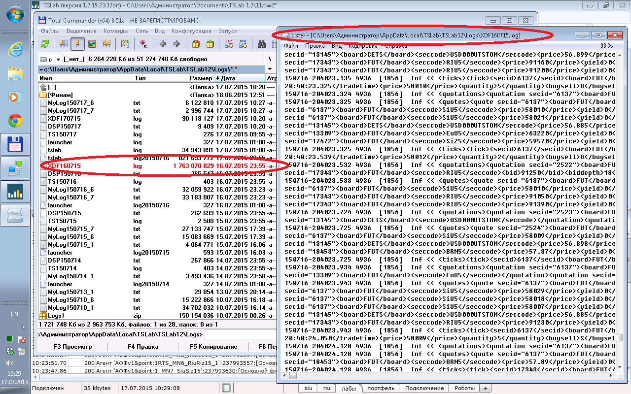 Но в данном случае на скриншоте выделен лог не TSLab,а лог Transaq коннектора.