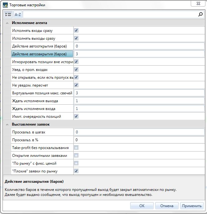 В хелпе написано "Действие автозакрытия (баров) - Количество баров, в течение которого пропущенный выход будет закрыт автоматически по рынку, если выбран параметр "Исполнять выходы сразу". Далее, если не хватило установленного кол-ва баров, будет выдано сообщение о пропущенном выходе и необходимости ручного вмешательства."