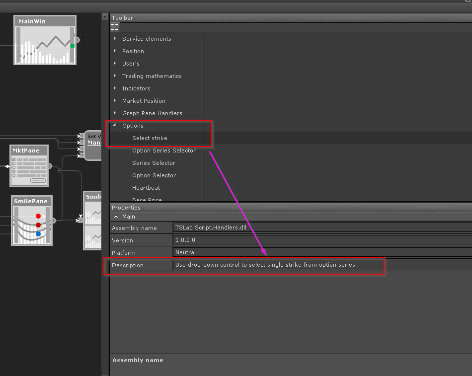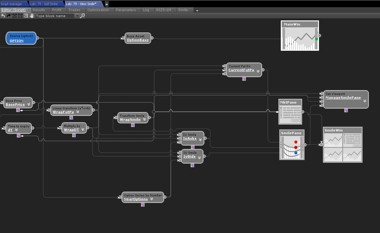 В этом простом скрипте нет торговли, но есть все необходимые элементы, чтобы подготовить FutPx, dT, улыбки по бидам-оферам + нарисовать их на CanvasPane (новый для ТСЛаб 2.0 элемент управления, который позволяет рисовать графические примитивы. Грубо говоря, "Любые линии на плоскости"). Потихоньку буду обновлять этот пост, комментировать назначение блоков и связи между ними.
