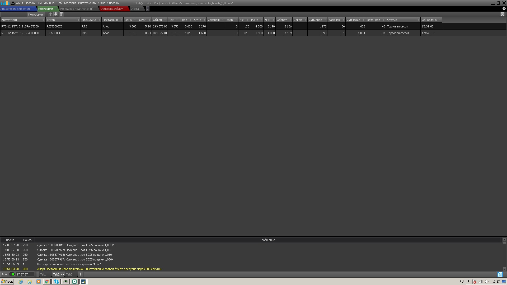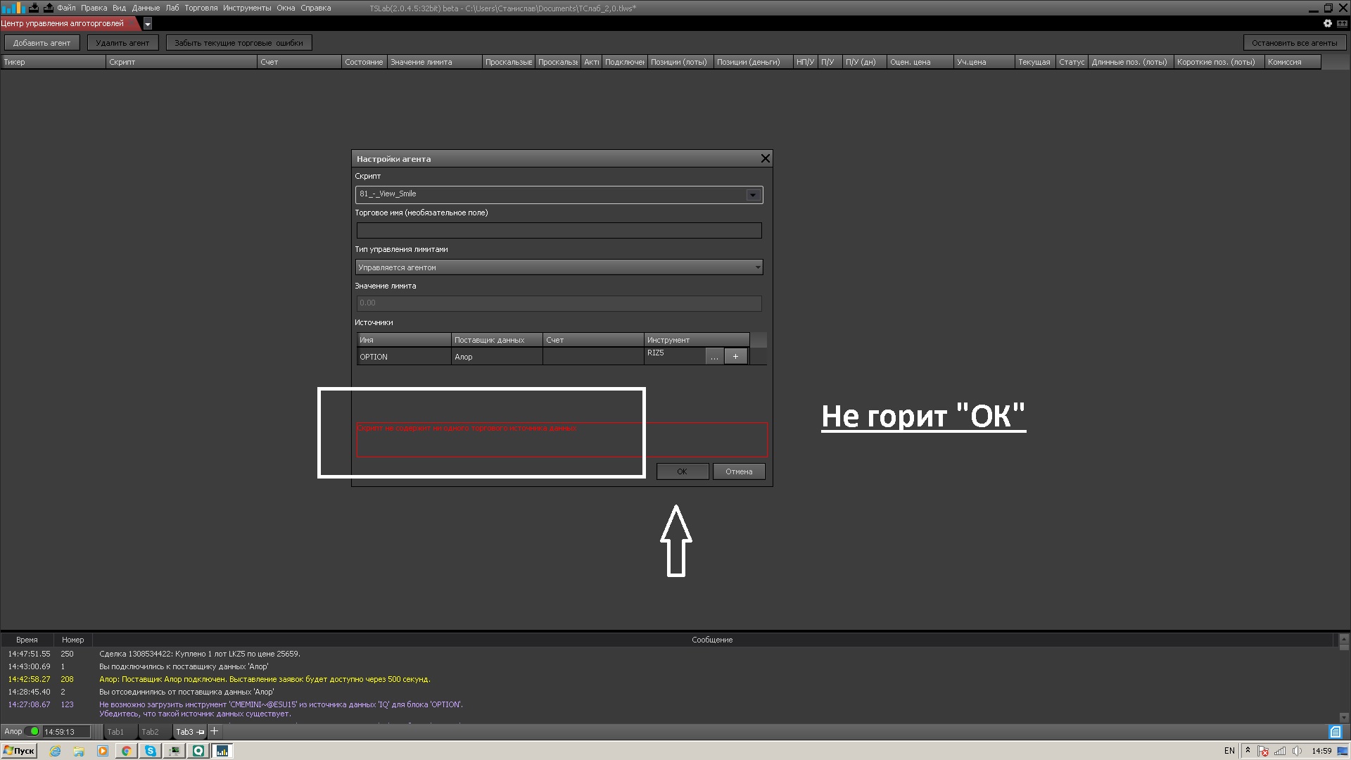 да. Скорее всего дело в настройках или кубиках, вроде все пересмотрел. В котировках есть!!! А именно в лабах улыбке нельзя добавить. Что то я упустил из виду Прикладываю сюда обновленную версию скрипта просмотра улыбки для ТСЛаб 2.0.4.7. Можем вместе в этой ветке попробовать разобраться что не работает?  Кстати, сейчас есть ещё более простой способ посмотреть улыбку -- через Доску Опционов. По скрипту. Вы подключаетесь к брокеру, данные идут, в котировках всё нормлально? Брокер транслирует теоретическую цену и теоретическую волатильность (проверить это можно в таблице "Котировки")? Теперь создаёте агент, назначаете ему Базовый Актив RIZ5, запускаете, открываете интерфейс агента -- и дальше что происходит? Что в Главном Логе программы написано (панелька снизу с текстовыми сообщениями о происходящем)?