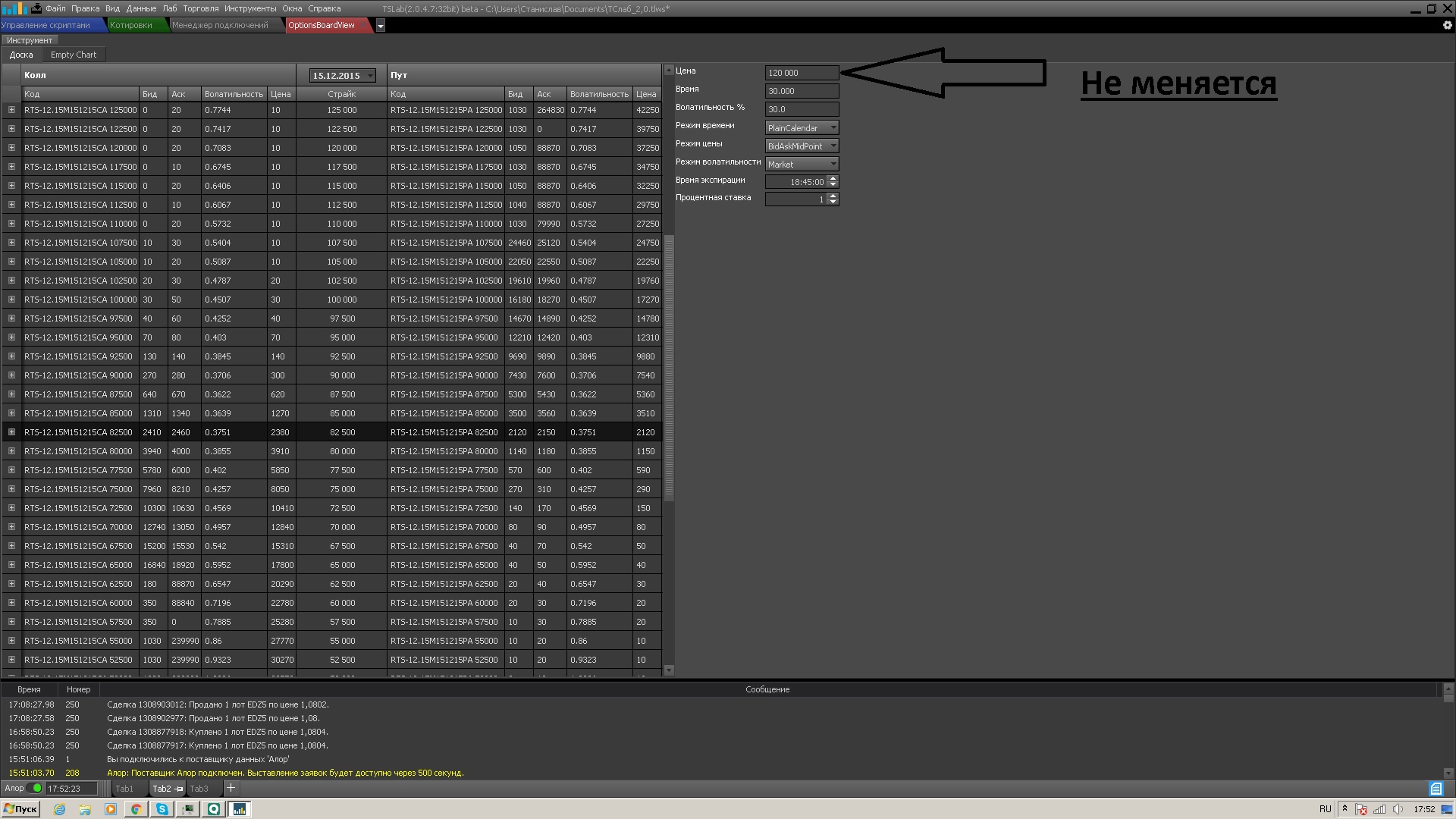 2. Доска может и настроилась, но очевидно ей очень плохо. По табличному представлению понятно, что волатильность и теор.цена транслируется нормально. А вот дальше дело застопорилось.