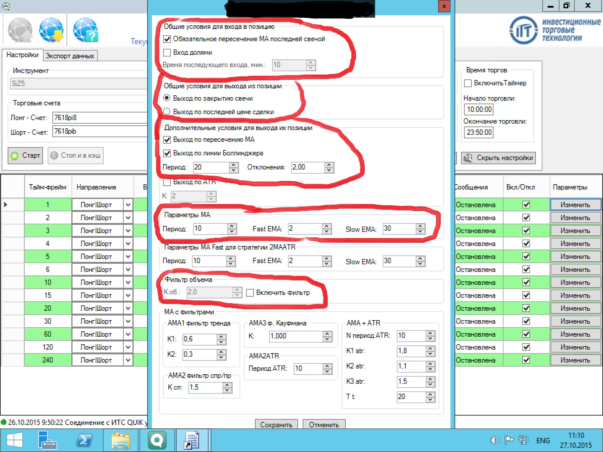 Условия выхода: Выход по пересечению MA, выход по линии боллинджера