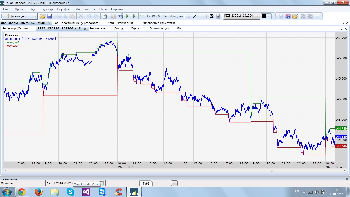 Пример: Работаем с Обновляемым значением«По просьбам трудящихся» (С) http://www.tslab.ru/ubb/ubbthreads.php?ubb=showflat&Number=7572#Post7572  и вообще по причине многочисленных и пока малоизведанных возможностей блока Обновляемое значение выкладываю вот такой примерчик. Задача. Считать количество моментов, когда некое Условие истинно. А при наступлении некого другого Условия, обнулить и начать считать заново. Реализация. Для решения нам потребуется само Условие. Пусть это будет простое пересечение Цены закрытия и EMA. Эти события мы и будем считать. А считать будем до тех пор, пока количество пересечений будет < некой величины, допустим 10. После этого нужно «сбросить» счетчик и начать заново. Разберемся сначала с подсчетом количества событий. Для начала назовем блок Обновляемое значение – accum. Далее собираем: • Блок Пересечения соединяем с блоком Обновляемое значение. Стрелка должна быть направлена от блока Пересечение к Обновляемому значению • Добавляем блок Формула. • Соединяем Блок Формула и блок Обновляемое значение так, чтобы стрелка была направлена от блока Обновляемое значение в блок Формула. Этим самым мы передаем хранимое значение блока в блок Формула • Пишем в блоке Формула: accum+1 • Теперь соединяем Блок Формула и блок Обновляемое значение так, чтобы стрелка была направлена от блока Формула в блок Обновляемое значение. Этим самым мы возвращаем в блок Обновляемое значение хранимую там ранее величину увеличенную на 1. Т.е. проще говоря, посчитали еще одно событие – «плюс один» Сейчас в блоке Обновляемое значение идет подсчет всех Пересечений. Осталось реализовать, чтобы выполнялось условие accum<10. Для этого модифицируем выражение в блоке Формула: