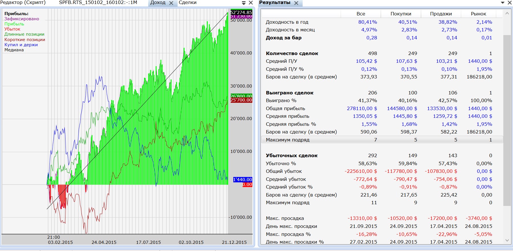 Добрый день, написал простенькую стратегию используется только один индикатор AMA фильтр на ее же основе, по фильтру выставляются каналы на пробой. На оптимизацию влияет по сути только один параметр.Торгует одним фъючом РТС. Абсолютная комиссия 20.