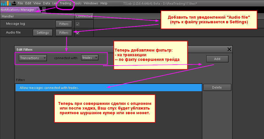 ТСЛаб, чтобы по факту совершения сделки он воспроизводил звуковой файл и/или показывал уведомление в трее.
