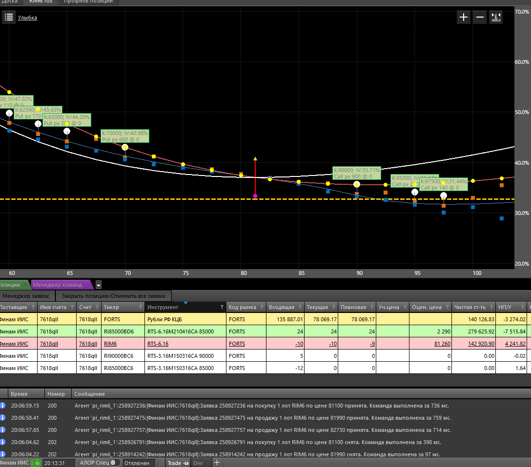 В 83 версии тестирую таким образом: есть стредл набранный колами и дельта хэджером по лимиту риска. Допустим страйк 82500. В котировщике выставляю продажу 2 колов 92500, продаю. Агент решает что это превышение риска, продает 2 82500, затем откупает 92500 проданные и снова покупает 82500. Логично, конечно, но зачем тогда котировщик, как им пользоваться? Как бабочку сделать в одном агенте? Или лучше через доску отдельно края продать?