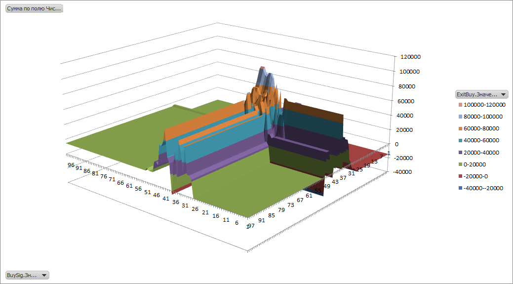 Рисовать гистограммы вы можете в экселе. Хоршо. Нарисовал прибыль случайной стратегии в разрезе двух переменных: BuySig и ExitBuy. Но испытываю затруднения в интерпретации результатов. Прикладываю рисунки плоскости под разными углами. Значат ли они, что стратегия ненадежна?