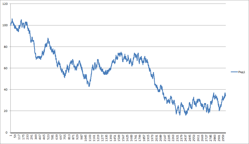 Рисовать гистограммы вы можете в экселе. В экселе вообще можно много чего сделать. Попробовал там сделать набор случайных чисел, и обнаружил функции СЛЧИС(), СЛУЧМЕЖДУ(). Но в данном случае больше подошла надсройка «Анализ данных» - «Генерация случайных чисел». Мне кажется, в тексте статьи есть ошибка в разделе «Случайно блуждание и генерация котировок». Либо я чего-то не понимаю здесь: «у нас есть 3 состояния: +1, 0, -1 и эти состояния равновероятны» Иными словами таблица вероятностей такая: 1 0.333333333 0 0.333333333 -1 0.333333333 Но затем следует: «генерируем случайное число от 0 до 1». То есть число -1 отбрасывается почему-то. В общем, последовал первому пункту и обнаружил, что случайная величина в выраженном нисходящем тренде.