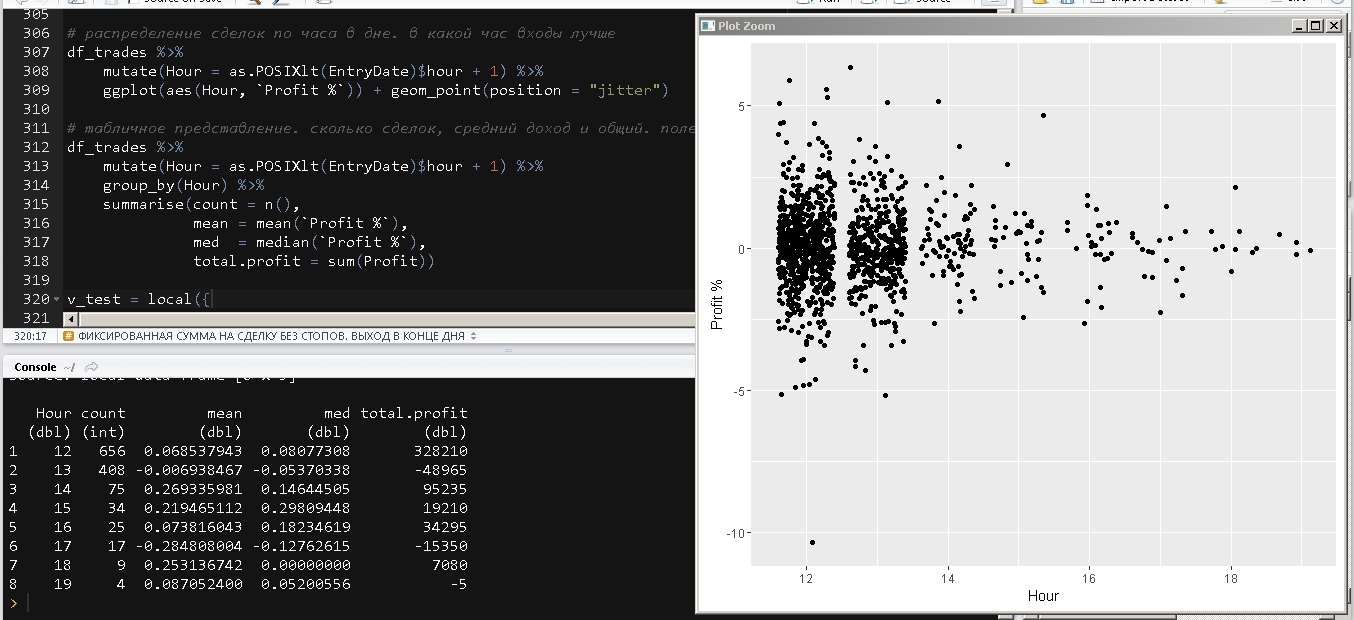 Вот из текущей работы кое что. Выделен код и результат его работы. Снизу таблица со статистикой и сбоку график. По факту просматриваются сделки по часам. На графике сделки слегка дрожат около своего часа, чтобы не было наложения. Сделки заранее уже загружены в таблицу. Это где то выше по коду. Но я не призываю садиться на R, сейчас модно Python хотя в среднем по миру они поровну используются. Майкрософт ударился с R и даже прикупил компанию одна и внедряет в свой sql сервер поддержку R кода. В общем развитие идет и там и там. Что получится увидим ). Программить на питоне пожалуй проще. прицепил файл тоже а то плохо видно
