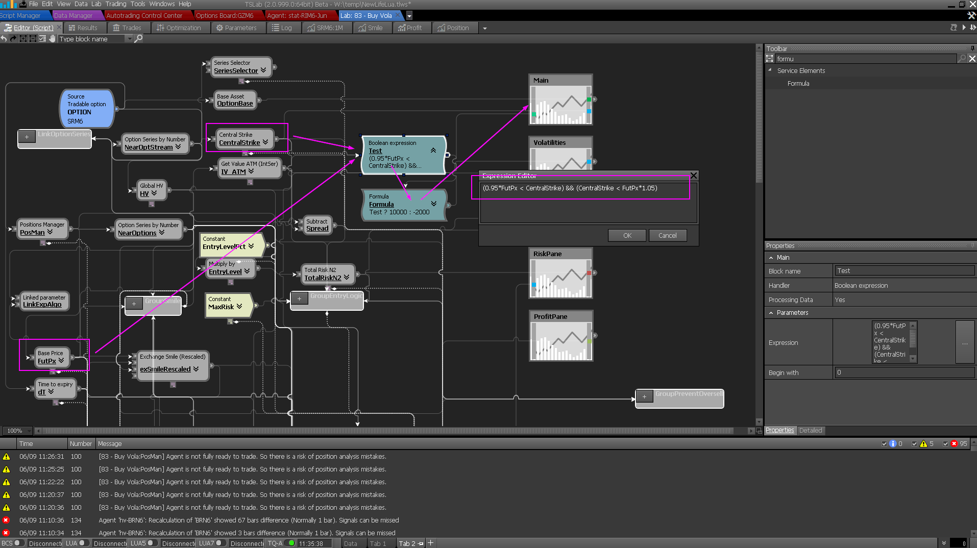 То есть, нужен блок покупки опционов на который нужно подавать логику покупки, центральный страйк, выбор серии и наверное все. Серию мы выбираем заранее. Улыбка нужна для того, чтобы знать цену опциона. Если Вы хотите вообще упростить ситуацию, то можете сделать фиктивную улыбку по модели Блека-Шолза (плоскую) и подать её на вход. Блока покупки, который принимает именно цену опциона сейчас нет. Можно попробовать пройти по цепочке: 1. извлечь из серии отдельный опцион блоком " Single option" == " Один опцион". 2. Подать этот одиночный инструмнт на обычный блок открытия позиции лимитной заявкой. =) Попробуйте и напишите нам о результатах. Мне даже интересно сработает или нет.