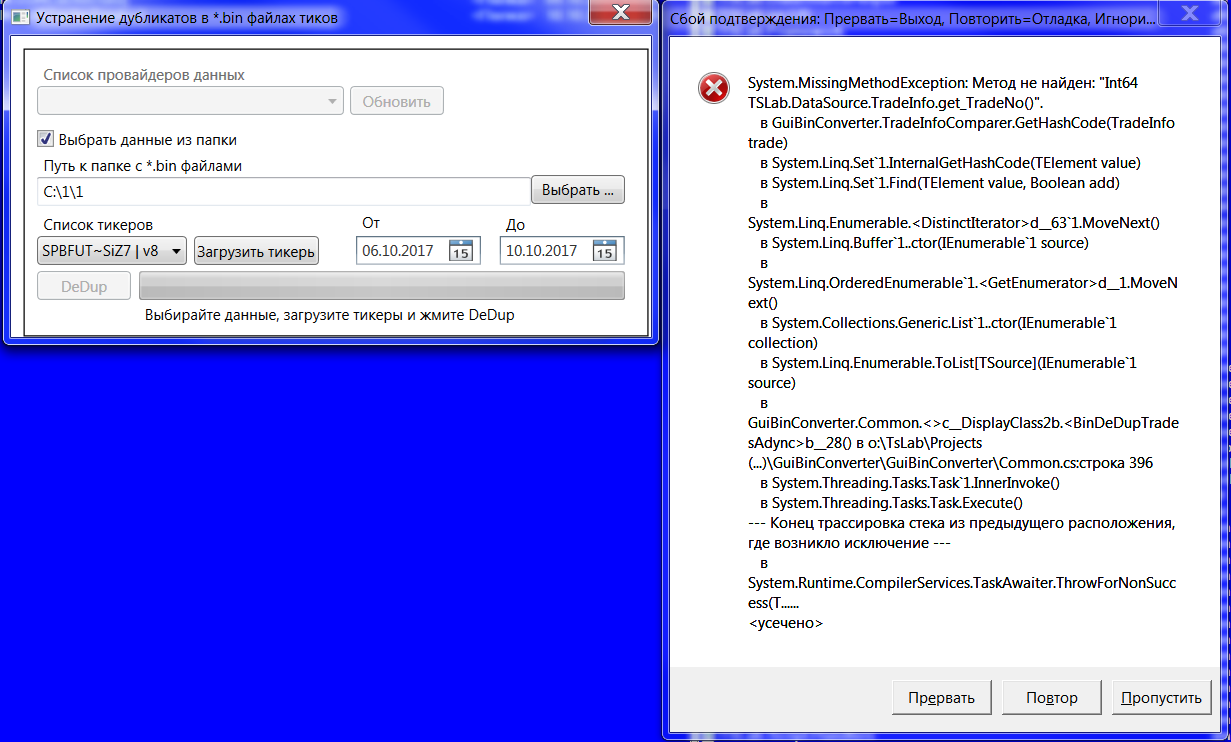 Эта утилита вообще живая? Должна работать с 2.0 или устарела? Я скачал и поставил версию 3.1 GuiBinConverter.light. Бины из .gz разархивировал. Выдает ошибки: -при попытке сконвертировать тики из bin в текст, -попытке проверить тики на дубли:
