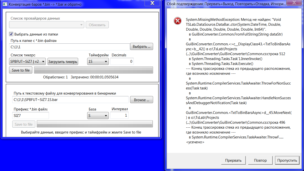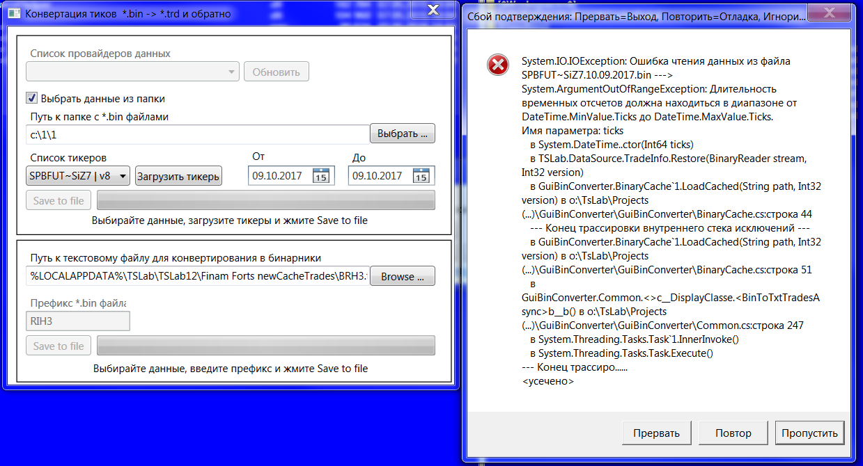 В общем, я попробовал поставить TSLab 1.2.31.0, скопировал туда GBC, результаты другие: 1. при конвертации бинов с тиками из TSlab 2.0 выдает ту же ошибку, что и у Vtumane (2 поста выше) - скрин прилагаю. 2. текст в бины конвертирует нормально (но не проверял, примет ли их TSLAB). 3. получившиеся бины конвертирует обратно в текст нормально.