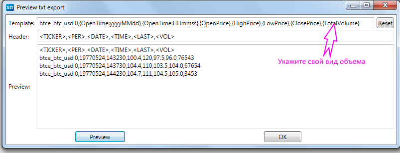 Свечи: <TICKER>,<PER>,<DATE>,<TIME>,<OPEN>,<HIGH>,<LOW>,<CLOSE>,<VOL> btce_btc_usd,0,{OpenTime:yyyyMMdd},{OpenTime:HHmmss},{OpenPrice},{HighPrice},{LowPrice},{ClosePrice},{Volume}