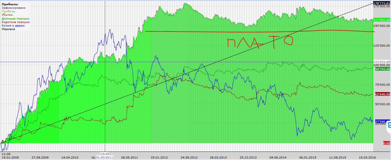 Робот торгует внутри дня с 10:10 до 23:00 выход из позиции по трейлу стопа, все позиции принудительно закрываются по рынку с 23:30 до 23:50 абсолютная комиссия на тестах использовалась 50 руб, объем 1 контракт, история с 2009 по 2016 год, начальный депозит 25000 руб. Больше всего беспокоит плато которое образовалось наверху. Как можно еще прогнать по тестам? И что значит заглядывание в будущее я использую метод декомпрессии №1, он вроде как не заглядывает в будущее. Хочу услышать ваше мнение спасибо!
