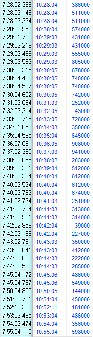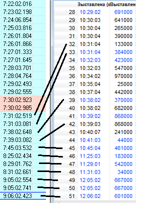 Слева время выставления заявок через первый тслаб (обычный транзак Whotrades), справа - через второй тслаб (HFTransaq финама). Работают одни и те же скрипты. Задержка не в пользу второго тслаба от 1 до 1.5 секунд.