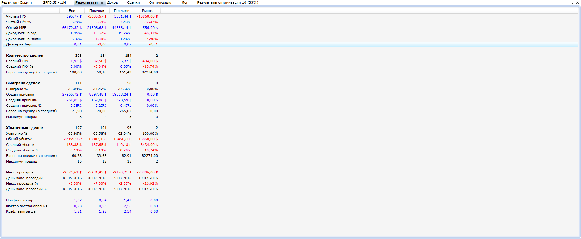Здравствуйте. Когда я оптимизирую скрипт, сделанный через TSLab API c#, у меня в визуальном редакторе в окне - Результаты оптимизации, появляются какие-то результаты. Но когда там написано в графе Доходность в год 27, я нажимаю 2 раза, ну или через Сохранить и выполнить, то у меня в самих результатах не такой показатель, а меньше там, ну и почти всегда так.. Я нажимаю на какие-то результаты, а на графике и в окне результаты данные другие. Хотя параметры такие же, какие и в строчке в Результатах оптимизации. Что может быть не так? В скриншотах я выбираю первый результат в Результаты оптимизации, там показывает 18,96 доходности в год, но потом в окне результаты почему-то 2% в год..