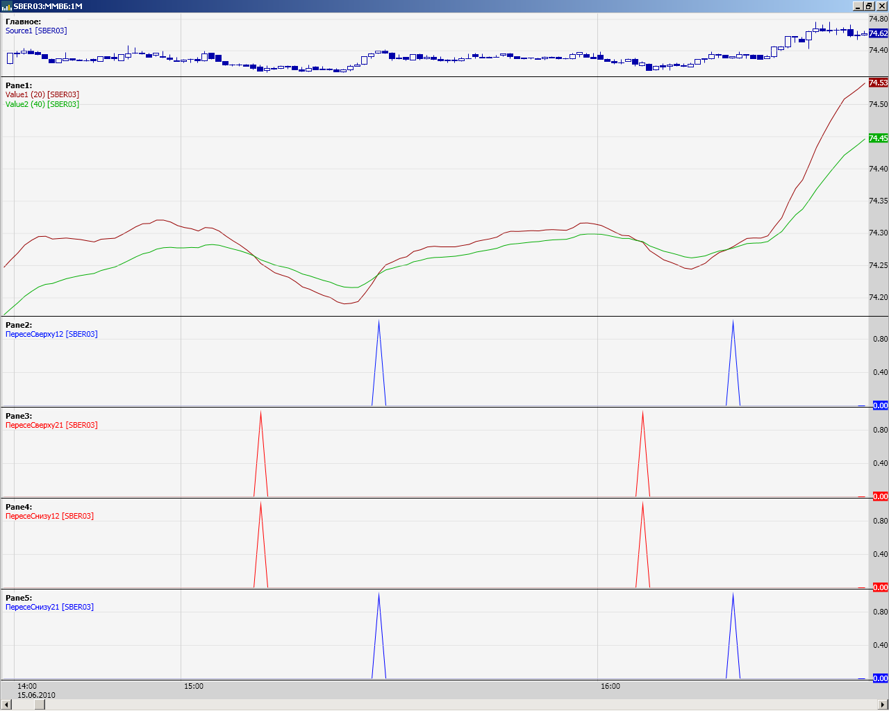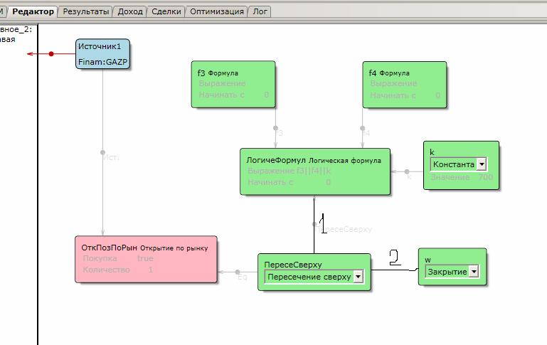 Пример: «Пересечение сверху», «Пересечение снизу», или что с чем пересекаетсяПожалуй, это одни из самых «путающих» и сбивающих с толку и, одновременно, очень простых в использовании блоков. Давайте разберемся, как правильно использовать эти блоки и при этом не запутаться. Для начала определимся, как работают эти два блока. Для примера нам понадобятся два индикатора. Возьмем для наглядности два EMA с периодами 20 и 40. Обозначим: • EMA с периодом 20 – Value1 • EMA c периодом 40 – Value2 Текущее значение обозначим индексом i. Блок «Пересечение сверху» . За этим названием скрывается следующая логика: 1[i]>2[i] && 1[i-1]<=2[i-1] Картинка: Блок «Пересечение снизу» . А за этим названием вот такая: 1[i]<2[i] && 1[i-1]>=2[i-1] Картинка:  Использование блоков подразумевает последовательное подключение входных значений к блокам, которым присваиваются номера 1 и 2. Порядок подключения входных значений к блокам имеет важное значение. В приведенном выше описании логики блоков цифры 1 и 2 как раз и обозначают номера подключений 1 и 2. Пояснение на примере. Если Value1 имеет номер подключения 1, а Value2 имеет номер 2 и используется блок «Пересечение сверху», то будет проверяться условие: Value1[i]>Value2[i] && Value1[i-1]<= Value2[i-1] Если поменять местами, Value1=2, Value2=1, то Value2[i]>Value1[i] && Value2[i-1]<= Value1[i-1] Фактически получаем аналог блока «Пересечение снизу». Аксиомы: • Использование «Пересечение сверху», если Value1=1 и Value2=2, равноценно использованию блока «Пересечение снизу», если Value2=1 и Value1=2 • Использование «Пересечение снизу», если Value1=1 и Value2=2, равноценно использованию блока «Пересечение сверху», если Value2=1 и Value1=2 • Если значение Value1 всегда равно значению Valuе2, то пересечения не будет