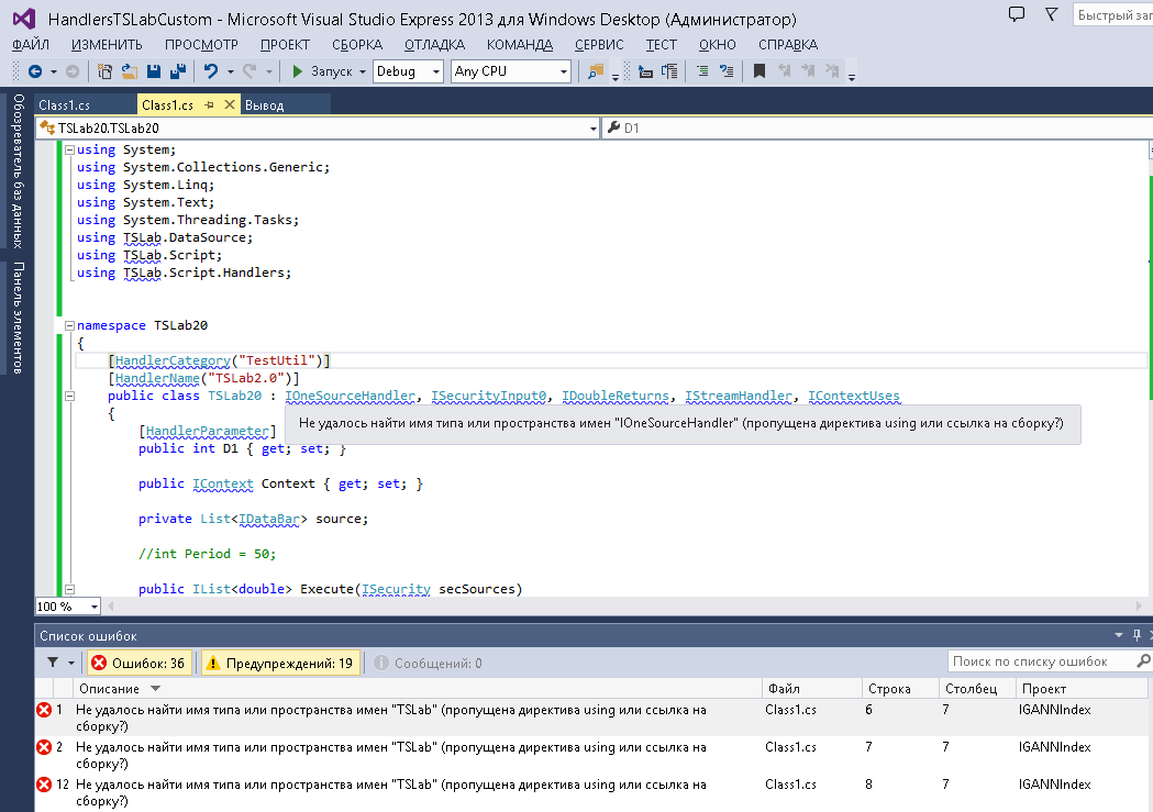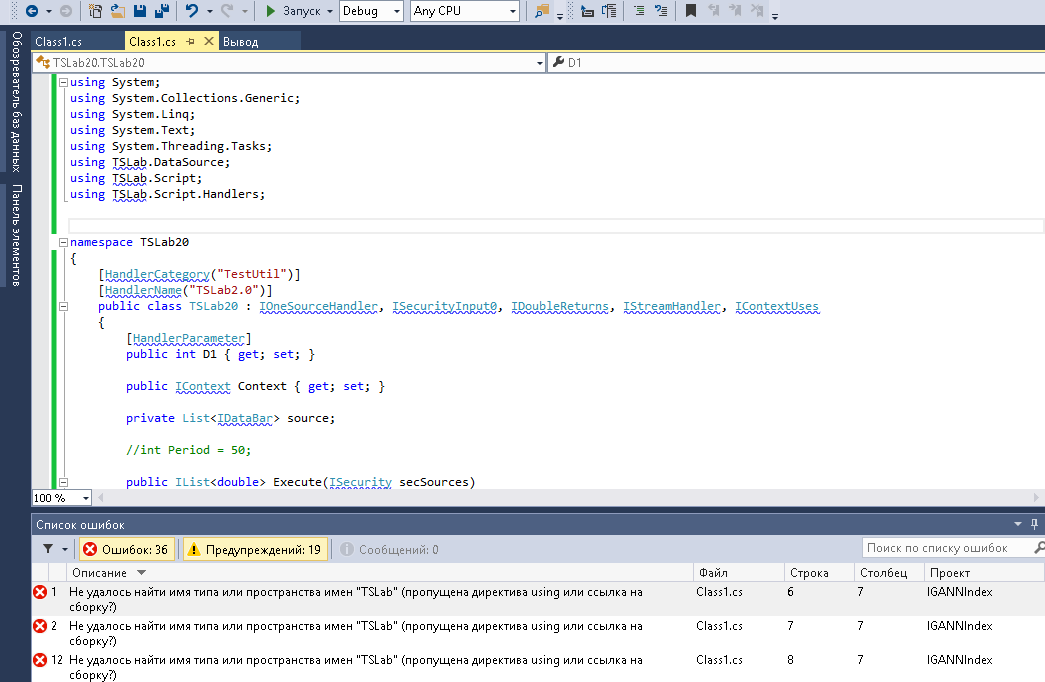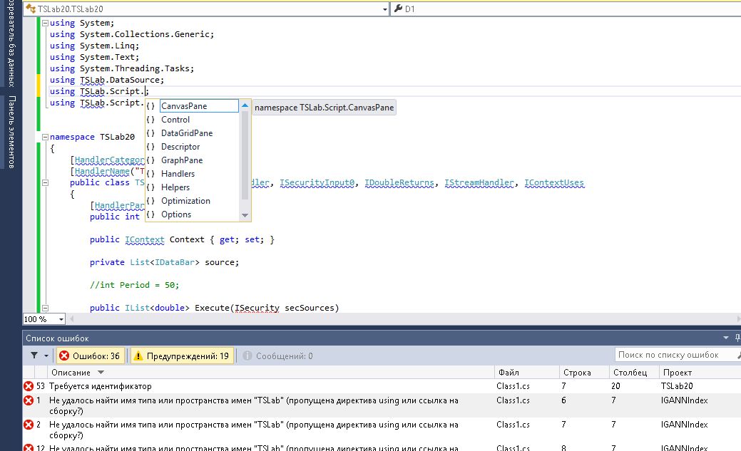 "Ошибка 27 Не удалось найти имя типа или пространства имен "TSLab" (пропущена директива using или ссылка на сборку?)"
