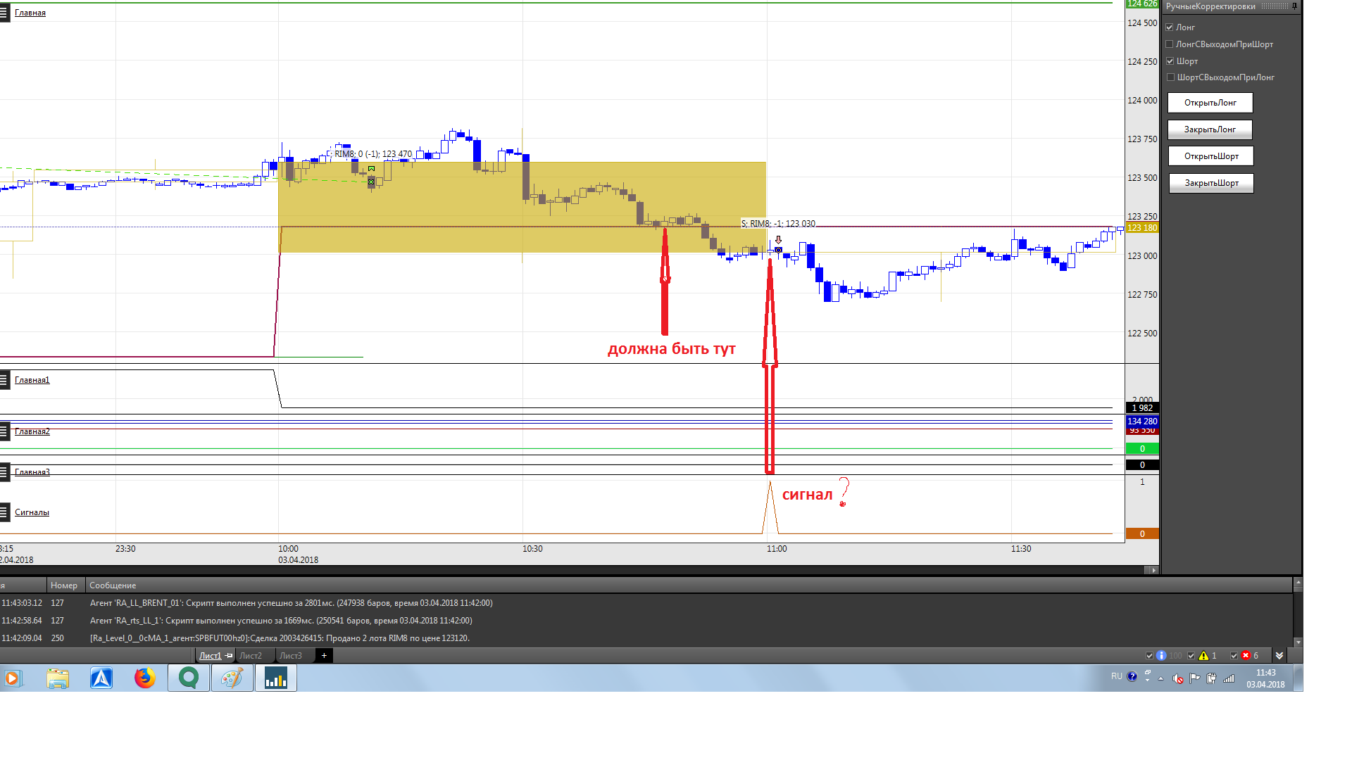 Да оказывается все свечки на месте. Там явно какая то другая проблема тслаба2 или квиклуа, т.к. делается непонятная задержка выхода по рынку, хотя сигнал подходит правильно и в лабе и агенте. И ещё почему то при выходе с задержкой сделки исполняются, да ещё и по 3 раза!!!, не отображаясь на графике агента, но присутсвую в таблицах Свои Сделки и Свои Заявки. Из-за чего такое может быть? В Службе поддержки тянут третий день, ответить не могут. Отыскал Ваш тикет. Вы уж извините, но третий день Вы не могли объяснить что не так. Но вроде там уже разобрались, ответят. В следующий раз так и пишите: " Вошли в позицию одним лотом, номер заявки такой-то, а вышли из позиции тремя лотами номера такие-то." Вот несколько вопросов к Вам можно: 1)в Менеджере Команд все сделки должны отображаться? В менеджере команд отображаются активные сигналы. 2)Какие галки в Менеджере Команд должны быть, если сделки прошли правильно? 3)Нужно ли обязательно для блоков: Выход по рынку, Вход, если больше/меньше еще дописывать проверку на количество лотов в лабе с фактическим на счете в квике и при обнаружении продавать\покупать сразу же после каждого входа\выхода? ну или что то в этом плане... 4) Реально ли на практике вообще отладить робота, при связке квик -квиклуа-тслаб, чтобы вообще таких простых и тупых ошибок ( как покупка в 3 раза больше лотов на ровном месте не возникало никогда? Или лучше сразу отказаться от такой организации торговли в какую нибудь другую самую надежную структуру организации торговли? 5)"Вид - график - правой кнопкой - перезагрузить данные." После этой процедуры по всем агентам свечки этого инструмента обновляются и за какой период? 6)"Вид - график - правой кнопкой - перезагрузить данные." Лучше нажимать по несколько раз в день для надежности?