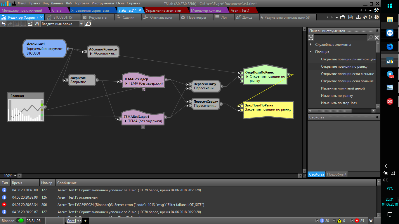 Здравствуйте, подключился к Binance, создал стратегию на кубиках с индикатором TEMA, на тестере всё круто работает, агент, как будто другой разработчик писал, с ним всегда на всех криптобиржах были проблемы,странно, что этот агент до ума не доведут, пытаюсь выставить лимитный ордер или по рынку, 04.06.2018 19:50:40 206 Агент 'Test1':328996758:[Binance:]:3: Server error: {"code":-1013,"msg":"Filter failure: LOT_SIZE"} Помогите пожалуйста.