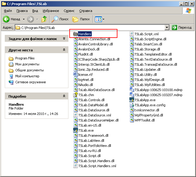 Handlers на одном уровне с папкой логов программы. Инструменты, - Папка с логами, - поднимитесь на уровень выше (C:\Users\NAMEUSER\AppData\Local\TSLab\TSLab 2.0\Handlers )