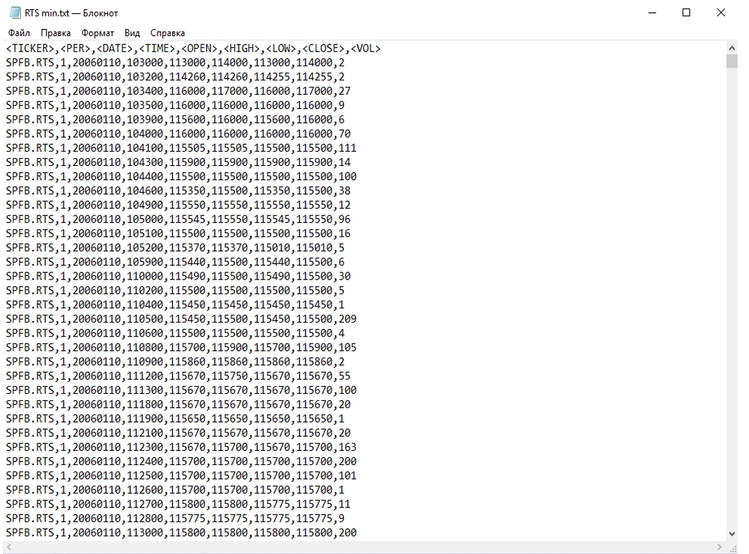 Очень скоро нашлась ещё одна проблема, Гидра встраивает в файлы в формате csv временной признак +3, который не нужен, и получалось, что в TSLab'е вся история была сдвинута на 3 часа вперёд. Торги начинались в 13:00, а заканчивались в 3:00. Именно тогда я психанул, удалил все файлы в формате csv и переделал шаблон и скрипт для работы с txt. Гидра экспортировала файлы в формате csv, но скрипт, склеивая их, менял их расширение на txt. Кстати, вот шаблон для минуток: