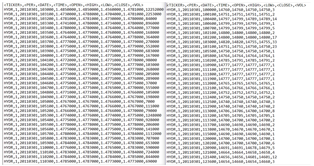 Кстати, интересен факт того, что скаченные данные уже неправильные, т. е. Это не экспорт шалит, а именно источник Финам. Вот сравнение скачанных данных, лежащих в папке Гидры (слева) и выходного файла (справа) после экспорта: