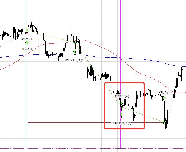 Здесь интересно поведение ТСЛаб, а именно (пример ниже): -- есть сигнал на закрытие по маркету (пересечение скользяшек) -- вместе с тем есть сигнал на добор, ТСЛаб добирает 1 лот, лотов становится 3, но закрывает ТСЛаб 2 лота, т.к. на начало бара их было 2шт, а 1 лот продолжает свое висение дальше по ходу пьесы. По идее позиция должна быть закрыта на этом баре, но фактически сначала происходит добор, а потом - не полное закрытие позиции, т.к. общее кол-во лотов после добора определяется некорректно. На такой случай желательно ставить "заглушку", то есть добирать только в том случае, если на баре нет сигнала на закрытие позиции.