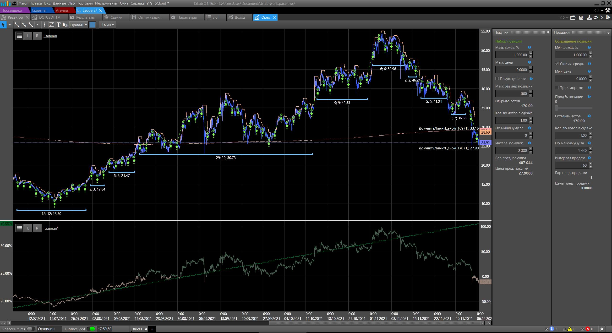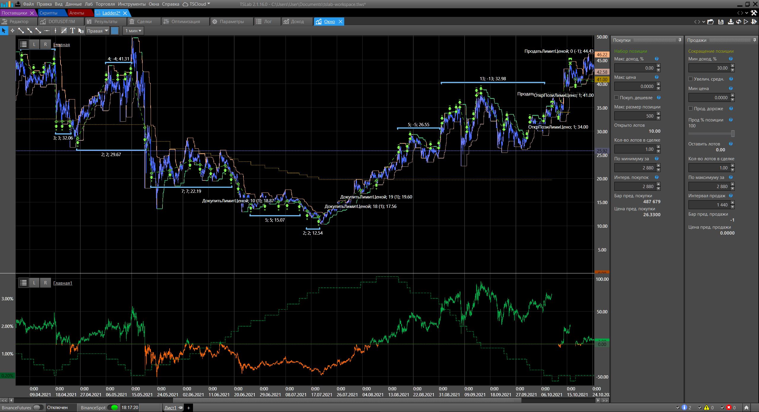 Скрипт Ladder2 автоматизирует эти действия, например, покупая раз в 4 часа (720 минутных свечей) по минимуму цены за последние 2 дня (2880 минутных свечей) и только при условии, что позиция в убытке от -5%. Все параметры настраиваются в контрольной панели.