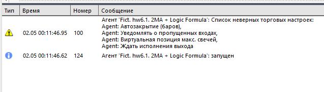 При запуске агента кубик проверяет соответствие настроек агента настройкам кубика и если данные расходятся, то по каждому параметру выводится сообщение в лог о неверной настройке. На выходе кубика в случае если настройки правильные true, если настройки неверные, то есть настройки агента не соответствуют настройкам кубика, на выходе false. Данный сигнал можно использовать в качестве одного из условий запрета на торговлю.