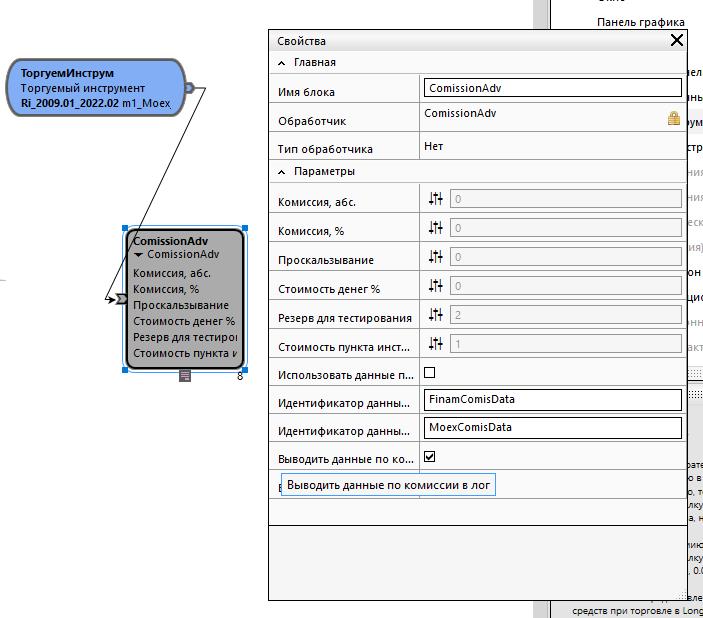 • Использовать данные по инструменту. При установленной опции комиссия и стоимость пункта получается из кубиков TickerBrokerComisData, TickerExchComisData, TickerSecPointPrice. При снятой опции используются значения, указанные в настройках кубика. При пересчете в лаборатории, кроме режима оптимизации кубик сообщает какие величины комиссий будут использованы.