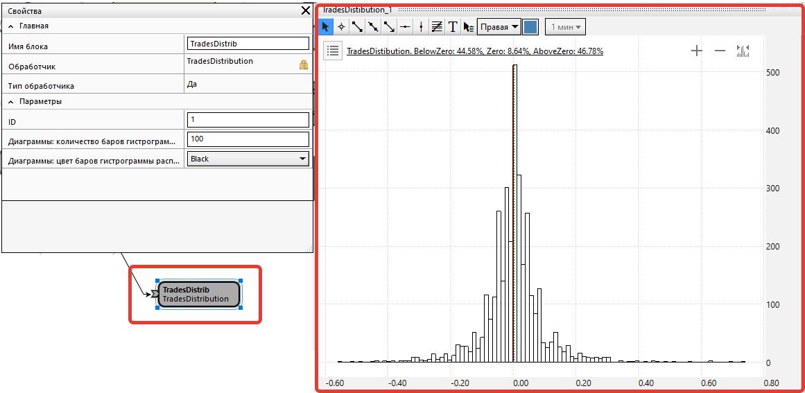 Кубик "TradesDistribution"Кубик строит гистограмму распределения доходности сделок исходя из дохода по каждой сделке в процентах. По оси "х" отложены доходности сделок, по оси "Y" - частота повторения доходности соответствующей величины (диапазона величины). Красная линия на графике - нулевое значение, зеленая пунктирная - средний размер результата сделки в процентах.