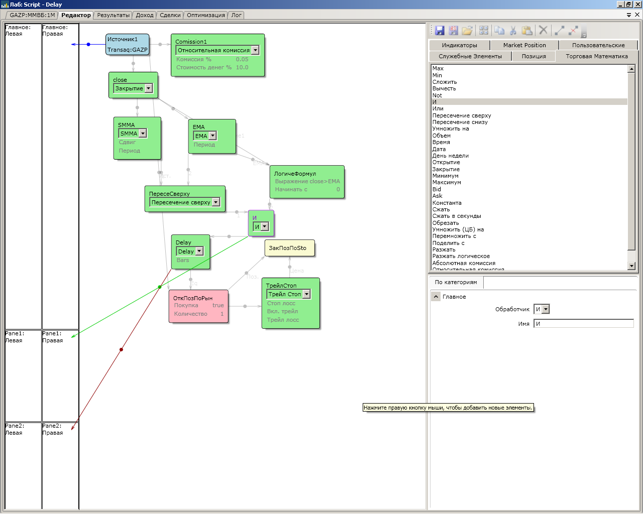 [img:left] http://clip2net.com/s/11Ois[/img] [img:center] http://clip2net.com/s/11OiL[/img] Приложил два рисунка. В целом проблема в чем: использую delay в качестве задежки на 5-10 баров. В итоге получаю что алгоритм тупо ждет 10 баров и все равно закрывает сделку, даже с учетом того, что условия закрытия уже не актуальны. (условие закрытие если цена ниже боллинджера, то закрываем лонг) цена опускается, и далее отсчет идет 10 баров, и все равно закрывается сделка. Может я не правильно воспринимаю задержку, так как оцениваю блок delay как задержку для проверки, если условия закрытия сохраняются, то закрываем сделку, если условия закрытия вернулись в русло, то можно продолжать держать открытую позицию.