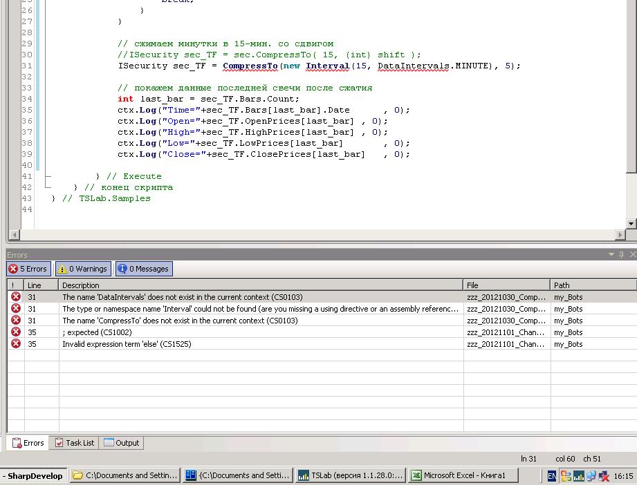 // покажем данные последней свечи после сжатия int last_bar = sec_TF.Bars.Count; ctx.Log("Time="+sec_TF.Bars[last_bar].Date , 0); ctx.Log("Open="+sec_TF.OpenPrices[last_bar] , 0); ctx.Log("High="+sec_TF.HighPrices[last_bar] , 0); ctx.Log("Low="+sec_TF.LowPrices[last_bar] , 0); ctx.Log("Close="+sec_TF.ClosePrices[last_bar] , 0); } // Execute } // конец скрипта } // TSLab.Samples ********************************************************