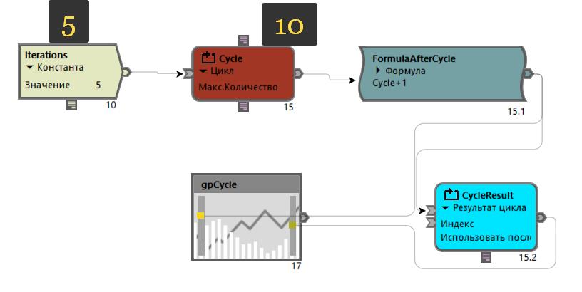 Кубик "Формула" и так всем знаком, а по кубику "Результат цикла" стоит дать пояснения. Согласно документации данный кубик считается окончанием цикла и содержит значение тела цикла, то есть результаты вычисления цикла на указанной итерации. Чтобы было понятно о чем речь, к примеру, у нас имеется счетчик, который на первой итерации каждого бара выдает 1, на второй 2, на третьей 3 и т.д. Задавая нужное значение на входе кубика "результат цикла" мы как раз и будем управлять тем значение, которое мы хотим получить. Есть один нюанс - нумераци итераций, как видно выше из конструкции цикла начинается с нуля, а не с единицы, соответственно, чтобы задать нужный номер итерации надо также начинать с нуля, то есть нужна итерация номер 1 - указываем на входе ноль, нужна итерация 2 - указываем на входе 1 и т.д.