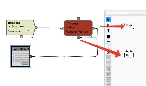 У кубика как и большинства других кубиков снизу имеется контрольный выход, который можнт быть соединен с контрольной панелью для управления параметром "кол-во итераций". В информационных целях, думаю, что не лишним будет упомянуть, что не только контрольный выход с кубика может быть соединенен с контрольной панелью, но и основной выход, в этом случае на контрольную панель будет выведено последнее известное значение данного кубика на последнем баре скрипта. Это значение отображается в контрольной панели как поле, которое нельзя изменить (предназначено только для чтения).