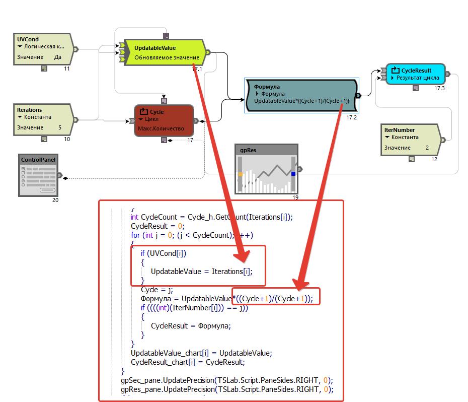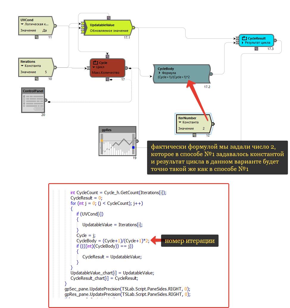 Как видно из кода - ничего не поменялось, то есть код обработки "ОЗ" располагается после цикла и никак в нем не задействован. Хм.. также не может быть, чтобы возможность подключения есть, но она ни на что не влияет. Пробуем еще изменить ранее собранную конструкцию - добавим выходящее из "ОЗ" значение в тело обработки цикла и посмотрим что из этого получится. Тут надо сделать оговорку относительно фразы "ни на что не влияет", как было описано выше (и описано в документации) данный вход используется для обозначения входа в цикл, то есть фактически данное соединение используется для того, чтобы создать саму конструкцию цикла и разместить ее в коде. Но можно ли как-то использовать само значение "ОЗ" в данном коде. "Да" - можно, причем для этого есть 2 варианта: первый вариант - подать данное значение от "ОЗ" в цепочку связей между циклом и его кубиком "Результат цикла"; второй вариант - разорвать цепочку и подать значение сразу в результат цикла, а обращение к итерации цикла подать из кубика "Цикл" на вход №2 кубика "Результат цикла", причем сделать это надо через формула, т.к. если подать напрямую, то связь соединится, но редактором будет выдана ошибка о том, что соединять кубик "цикл" с другими кубиками, кроме формул нельзя (Элемент 'Cycle' содержит ошибку: Выход обработчика "Цикл" может быть соединён только с формулами). Примеры и сгенерированный код ниже.